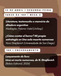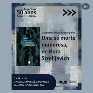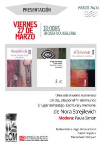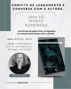 A escritora argentina Nora Strejilevich (Buenos Aires, 1951), estará em Santos no sábado, dia 18, para conversar sobre seu livro Uma só morte numerosa, na Livraria Realejo. O encontro começa às 18 horas e a Realejo fica na Avenida Marechal Deodoro, 2, no Gonzaga, em Santos.